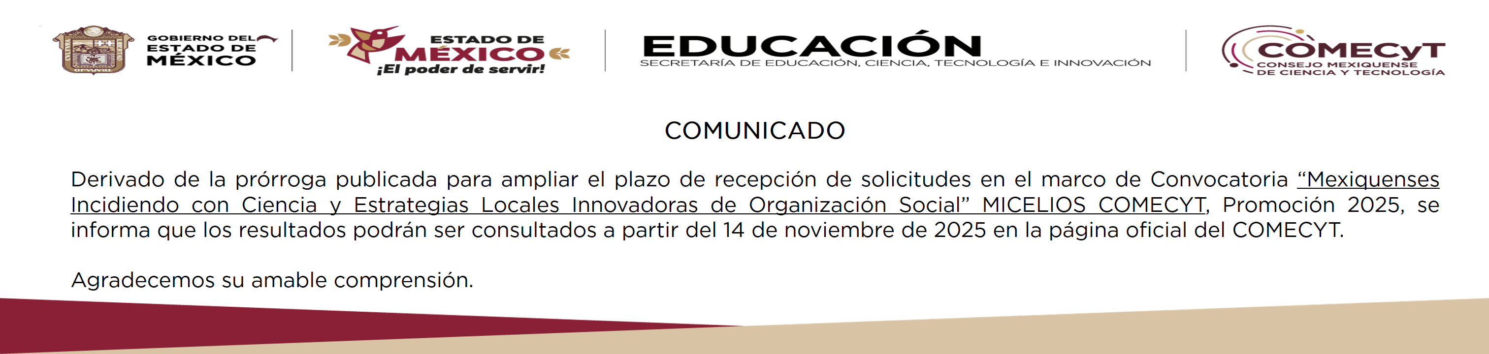 El Programa Mexiquenses Incidiendo con Ciencia y Estrategias Locales Innovadoras de Organización Social, MICELIOS COMECYT tiene como objetivo impulsar la ciencia horizontal y de impacto, a través del otorgamiento de becas consistentes en apoyo monetario para que mexiquenses mayores de 21 años con conocimientos y experiencia en incidencia y adaptación o mejora de procesos en las en ciencias del agua, medio ambiente, agrícolas y forestales cursen el programa académico MICELIOS COMECYT y desarrollen un proyecto de incidencia en el Estado de México.