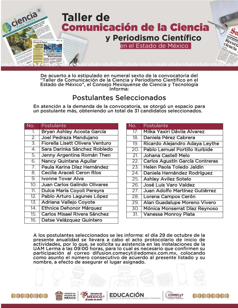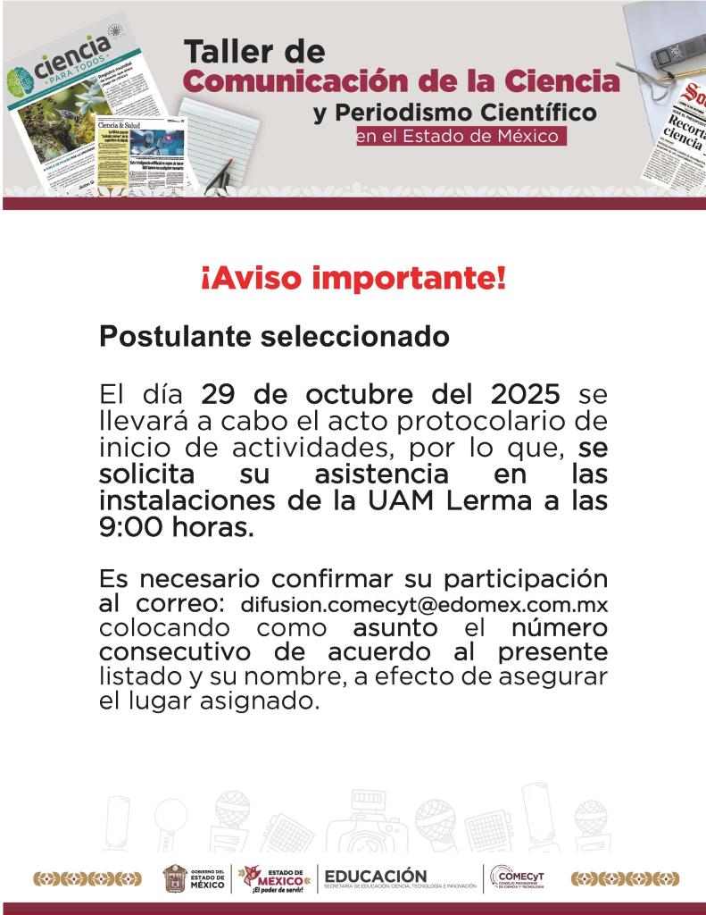 Estudiantes y egresada(os) de carreras en comunicación o afines, periodistas, comunicadoras(es) y académicas(os) mexiquenses, o personas interesadas en realizar actividades de divulgación y periodismo científico, con el objetivo de acercar el conocimiento a la sociedad.